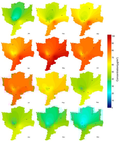 As can be seen from Figure 1, the overall spatial distribution characteristics of the ozone concentration in Changchun are similar to those in other cities [,]. It is shown that the ozone concentration in the periphery of Changchun is higher than that in the center of the city, and the ozone concentration in the south of the city is higher than that in the north of the city. Except for 2013, the ozone concentration of IPT station was the lowest among the nine inner stations. Taking the IPT station as the center, the urban central area covered by the IPT, CP, and BFH stations in Changchun is the area with low ozone concentration. The highest average ozone concentrations were observed at the stations JYP and SWZ, located outside of the urban area to the southwest, while at the same time the prevailing wind direction is from the south in Changchun with relatively strong winds. These are strong signs that the background ozone levels in the area might originate from various processes including long-range pollution transport and tropospheric subsidence []. From 2013 to 2017, the ozone concentration at JYP station was always the highest among the nine sites. JYP station is located in a national scenic spot with high vegetation coverage, low traffic volume, and no pollution sources nearby. So, the large amounts of ozone precursor that are released by plants [], blown upwind, and transported over long distances [] may be the main reasons for the high concentration of ozone in this region. We used a kriging interpolation method in Surfer software to process the monthly average ozone concentration for five years in Changchun at these sites from 2013 to 2017, and we plotted the contour map as shown in Figure 2. The spatial distribution characteristics of the ozone concentration in Changchun are reflected in all time periods, and the monthly spatial distribution of ozone concentration is basically consistent, which conforms to the above laws.