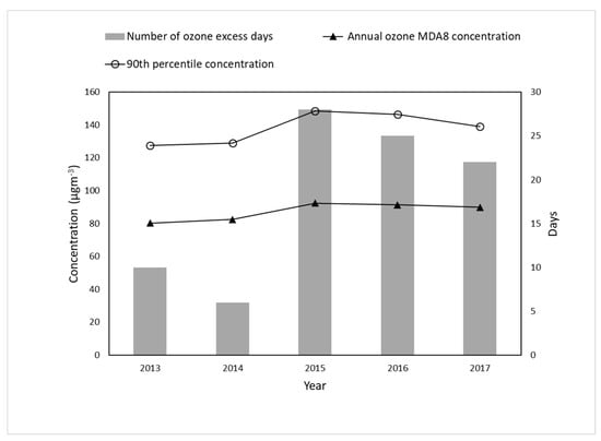 Annual O3 daily maximum 8 h average (MDA8) concentrations and its 90th percentile variation and the number of O3 excess days in Changchun from 2013 to 2017.