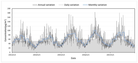In order to analyze the five-year trend of ozone in Changchun in more detail, we calculated the daily, monthly, and annual average ozone concentrations from the 8-hour moving average values. The results are shown in Figure 4. Firstly, the annual average ozone concentration changed slightly from 2013 to 2014, rising by 19% in 2015, and then changed slightly in the following three years. Secondly, the monthly average concentration of ozone presents an obvious annual cycle. The concentration is low in the first and last cold months of the year in Changchun, and the lowest concentration occurs in December; during the warm months in the middle of the year, the concentration of ozone is relatively high, and the highest concentration of ozone, which fluctuates greatly every year, occurs in May–August. The monthly peaks of ozone concentration were in May in 2013 and 2016 and the peak was in July in the remaining three years. The long-term average annual value of daily ozone concentration was 57 µg/m3. From 2015 to 2017, the number of days with high ozone concentration increased, and the annual average ozone concentration increased generally compared with the previous two years.