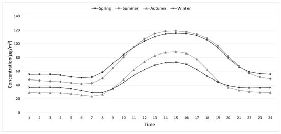 The diurnal variation of the multi-year average ozone concentration over the four seasons in Changchun (Figure 5) shows a single peak trend. The concentrations in spring and summer were higher than those over the whole year and higher than those in autumn and winter. The peak ozone concentration was in the order summer > spring > autumn > winter, occurring at 14:00 p.m., and the valley concentration was in the order spring > summer > winter > autumn, generally occurring at 6:00 a.m. but at 7:00 instead in winter. The daily distribution of the ozone concentration in Figure 5 also presents diurnal and nighttime variation. During 11:00–21:00 in the daytime, the concentration of ozone in summer is higher than that in spring, while at other times that in spring is higher than that in summer. Similarly, diurnal variation of the ozone concentration in autumn and winter is also observed at 9:00–19:00. The major wind direction in spring at a synoptic scale is westerly in Changchun, which transports higher background ozone to East Asia. On the other hand, the major wind direction in summer is southerly [], which transports cleaner air from the south. High values of near-surface ozone concentration appear in spring, which may be caused by large-scale air mass transport or stratospheric exchange caused by “tropospheric folding”, which may lead to a high concentration of tropospheric ozone in spring. Studies have shown that the tropospheric ozone concentration shows an increasing trend or abnormal value in spring, which is largely attributed to stratospheric ozone []. In summer, the daytime solar radiation is stronger and photochemistry reactions are more active. Near-surface NO depletes ozone and reduces its concentration. As shown in Figure A1, the concentration of NO in Changchun is higher in spring than in summer at 8:00–23:00 in the daytime and higher in summer than in spring at other times; this is also the reason why a high concentration of ozone occurs in spring at night, but there is no clear evidence to show the reason why a high concentration of ozone occurs in spring []. The diurnal and nocturnal variation of the ozone concentration in autumn and winter can also be explained by NO. The concentration of NO in Changchun is higher in winter than in autumn from 7:00 to 17:00, while it is higher in autumn than in winter at other times. The seasonal and diurnal variation of the NO concentration in Changchun is exactly opposite to the variation of the ozone concentration.