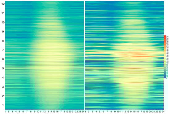 From the seasonal variation maps of ozone concentration (Figure 5) and 24-h stack maps (Figure 6), it can be seen that the diurnal variation of ozone presents a single peak distribution. Figure 5 is the eight-hour moving average value of ozone and Figure 6 is the hourly value of ozone; both charts show that low concentrations of ozone occur from 23:00 p.m. to 6:00 a.m. and high concentrations of ozone occur from 10:00 a.m. to 20:00 p.m. The maximum occurs at 14:00–16:00 p.m. and the minimum occurs at 07:00–08:00 a.m. The accumulation regularity of ozone pollution is roughly divided into three stages: the accumulation stage of ozone and precursors, the photochemistry generation stage of ozone, and the ozone depletion stage []. From midnight to early morning, the concentration of ozone in the urban atmosphere is in the low concentration portion of the day. Although there is no photochemical reaction at night, the near-surface NO will continue to deplete ozone through constant rapid consumption reactions with a small range of time. Therefore, the lowest level of ozone concentration in Changchun appears at 07:00–08:00 in the morning and then increases rapidly, which is usually due to ozone entrainment from the free troposphere after the breaking of the nocturnal boundary layer. While 08:00–17:00 is mainly the stage of ozone optical chemical formation, with the emergence of morning rush hour, a large number of ozone precursors are released, and the intensity of solar radiation begins to increase gradually. The strong solar radiation is prone to producing a series of photochemical reactions. The free tropospheric influence attains its maximum in the afternoon hours when the thermal mixing also attains its maximum, while local in situ photochemical ozone production is maximized around noon, which makes the ozone concentration rise and reach its maximum value in a day at 15:00.
