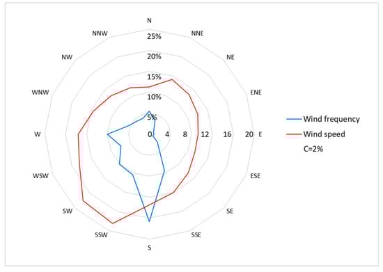 Wind speed (km/h) and direction frequency (%) chart of ozone excess days in Changchun in 2015.