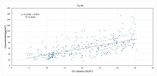 Because of the strong positive correlation between O3-8h and O3-1h concentrations, we chose the solar radiation data and the O3-8h data for correlation analysis and linear fitting (Figure 8). There is a strong positive correlation between ozone concentration and solar radiation in Changchun, with a correlation coefficient of 0.65. O3 concentration increases with increasing solar radiation, but there is little difference under different radiation conditions: only in the case of high radiation intensity of 30–40 W/m2, the ozone concentration exceeds 140 µg/m3. Some studies from the literature have shown that when radiation is low, the value of the O3 concentration is small, and it increases with increasing radiation. It is noteworthy that the relationship between ozone and solar radiation is not a simple linear relation. Zhao et al. [] considered that when the solar radiation is higher than a certain value (about 40 W/m2), with increasing radiation, the value of the O3 concentration does not increase but decreases. However, the solar radiation in Changchun does not exceed this limit, so there is no such relationship. When studying the influence of temperature on ozone concentration, some scholars believe that when the temperature is higher than a certain threshold, the excessive temperature conditions will reduce pollution emissions and increase the diffusion speed, resulting in a decrease in the concentration of nitrogen oxides and VOCs in the air and thus reducing the concentration of O3 near the ground []. This can also explain the decrease in the O3 concentration near the ground when the solar radiation reaches a critical value.