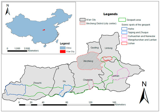 The Qinling Mountains are a major east-west mountain range that provides China with a transcontinental natural boundary between its northern and southern regions, including distinguishing their geology, geography, ecology, climate, and humanities [26]. This study’s sites (Figure 1) were four scenic spots of the QZUGG in the main part of the Qinling orogenic belt [26]. Preliminary fieldwork and an interview with a management official suggested the importance of the Zhuque, Taiping, Cuihuashan, and Wangshunshan scenic spots as research targets. These four locations are the most useful because of their relatively long histories, high prestige, and large numbers of tourists. Located in southern Xi’an, QZUGG, which is usually regarded as the “Chinese Central National Park,” covers an area of about 1074.85 km2. Of all the world’s geoparks, QZUGG is the closest to a large city because it is a mere 25 km from Xi’an [26]. QZUGG boasts eight scenic spots (Figure 1). However, these eight spots are designated as National Forest Park or National Geopark, and, therefore, they are independently managed by different government agencies (Table 1). In 2009, QZUGG was designated a member of the Global Geopark Network (GGN) and named Qinling Zhongnanshan UNESCO Global Geopark after validation [28].