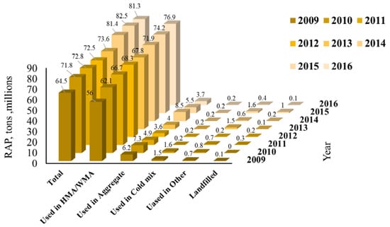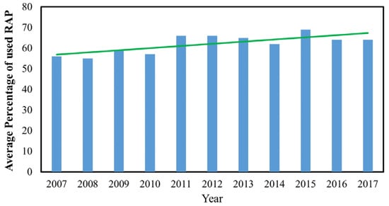 Although the amount of available, and the use of, RAP materials is a function of construction activities at all levels, the National Asphalt Pavement Association (NAPA) reported that usage of RAP in asphalt mixtures reached 76.9 million tons in 2016 in the United States, which shows a 3.6% and 37% increase in using of RAP in 2015 and 2009, respectively [1] (Figure 3). Additionally, in Europe, reusing RAP in asphalt mixture production started more than 40 years ago, and currently it has an increasing trend in many European countries. Table 7 shows the percentage of total available RAP materials that have been used in the production of HMA, WMA, HWMA, and cold recycling for some European countries from 2007–2017 [63]. Additionally, based on the average value of total used RAP for each year, the trend of using RAP in the production of different types of asphalt mixtures is upward, but has a low slope (see Figure 4). However, some obstructions limit the use of RAP material to make high-quality asphalt mixtures with most environmental and economic benefits [64]: