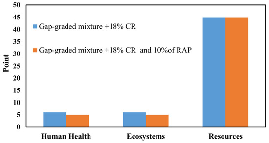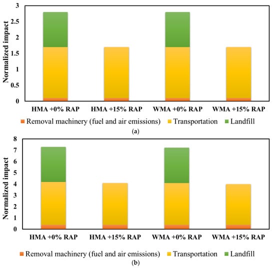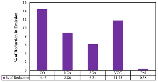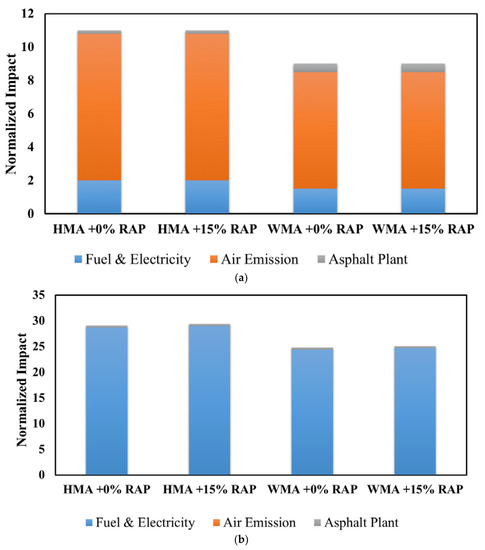 Using 10–20% RAP in the HMA mixtures, Giani et al. [71] indicated that there was 6.8% and 6.4% reduction for greenhouse gasses (ton CO2eq) and the single score endpoint impact, respectively, for a 15 years lifespan analysis. Furthermore, 40% reduction in emission of the CO2e was reported when 75% RAP was in a production of HMA mixtures. The comparison between GHG emissions for virgin and 20% RAP mixtures (Figure 5) revealed that adding RAP can result in averagely 8.3% reduction in air pollutant parameters such as carbon monoxide (CO), oxides of sulfur (SOx), oxides of nitrogen (NOx), volatile organic compound (VOC), and particulate matter (PM) [75].