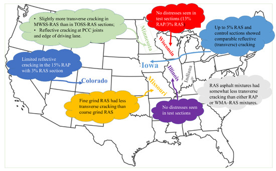 In terms of long-term performance, the statistical analysis on the performance (load-associated distresses) of virgin and RAP mixtures at 18 long-term pavement performance pavement (LTPP) SPS-5 sites and test sections with similar traffic and environmental conditions, revealed that the majority of RAP mix overlays was statistically equivalent to virgin HMA overlays over a period of up to 17 years [84]. The other study on eighteen projects, comprised of 162 sections from LTPP SPS-5, to compare the long-term performance of virgin and RAP mixes was conducted by Gong et al. [85] using data analyses and logistic regression (see Figure 10). Compared to virgin mixtures, results of existing RAP in mixtures on the performance of overlay mixtures can be summarized as follow: