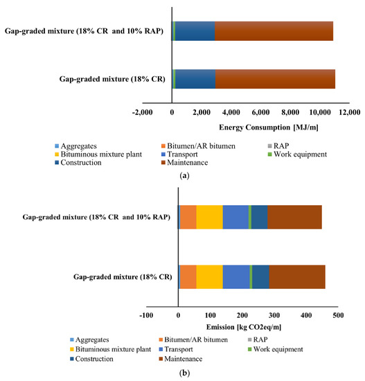 Therefore, using this approach, the better control of RAP moisture content can be achieved. A study reported an increase in energy consumption up to 14% and 17% could be observed when 15–30% and more than 45% RAP, respectively, were used in new asphalt mixtures [73]. However, the other studies stated that producing asphalt binder consumes 3,110,090 MJ of energy and releases of 226,870 kg of GHG and replacing 50% of RAP as binder replacement can result in 17–28% reduction of energy consumption as well as emissions [74,75].