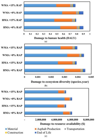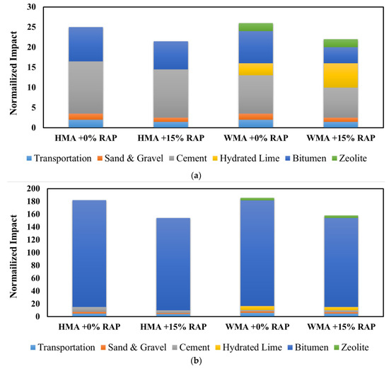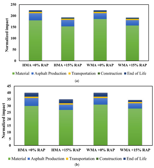 Before production, preparation of raw materials including aggregate and asphalt binder also demands energy that should be looked into when conventional virgin aggregate and/or asphalt binder are replaced by other materials. Generally, the following factors have significant effects on the environmental impact of asphalt mixture production using RAP: moisture content, HMA discharge temperature, RAP content, transport process, and quality of RAP [66,67,68,69,70,71].