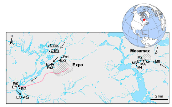 The sites selected for this study were located on the Nunavik Nickel Inc. mining complex. The Nunavik Nickel mine is located in Northern Quebec, 82 km west of Kangiqsujuaq and 140 km south-east of Salluit. Mining activities started in 2012. Two sites (open pits; Mesamax and Expo) were in activity at the time of the study (2014–2016), each one discharging wastewater effluents (June to September) from independent treatment facilities into different tributaries of the Puvirnituq River (Figure 1). Sampling stations (16 or 17, depending on the sampling campaign) were selected along a metal concentration gradient, including reference stations (controls). The treated wastewater effluents from the Expo site were released about 5 km from the Expo site in a tributary of the Puvirnituq River, where three sampling stations were located along a 1.4 km gradient (stations Ef1 to Ef3). Station Ef0 was positioned upstream of the treated water effluent but may have been affected by nonpoint source contamination from the Expo site. A control station was sampled in a tributary located in close proximity (station C). Four sampling stations were selected in small watercourses near the Expo site tailing ponds to monitor potential nonpoint source contamination (Ex1 to Ex4). Two additional control stations were positioned in a river about 1.5 km north from mining activities (C1Ex and C2Ex). At the Mesamax site, five sampling stations were positioned along a potential gradient of metal contamination in another tributary of the Puvirnituq River, from the wastewater effluent to 1.2 km downstream (stations M1 to M4 and MA). Station M1 was located in close proximity to the Mesamax site but did not receive treated wastewater effluents. Station MA was added in 2015 (a few meters from M2) to be within the plume of the wastewater effluents from Mesamax. A control station was also sampled in this tributary, upstream of the mining effluent (station M0).