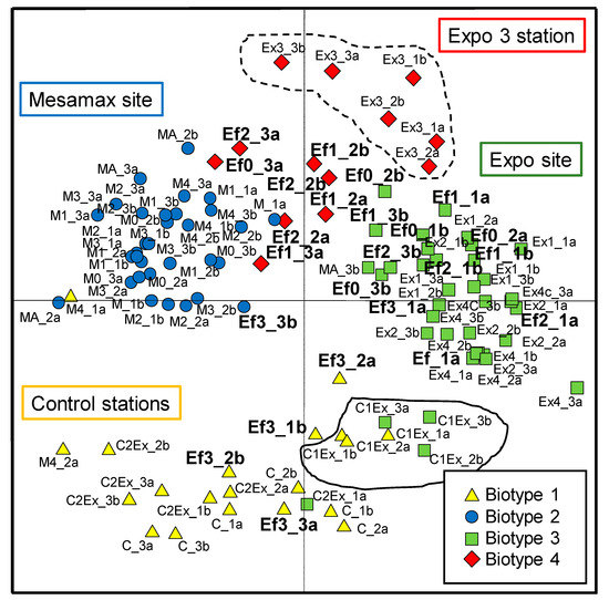 The PCA presented in Figure 2 shows the spatial and temporal distribution of the diatom samples that were color-coded as a function of their belonging biotypes (created using SOMs). Biotype 1 (yellow triangles) included all samples collected at our control stations, biotype 2 (blue circles) mainly contained samples collected at stations located around the Mesamax site, biotype 3 (green squares) grouped most samples from Ex_ and Ef_, and finally biotype 4 (red diamonds) was a mixture of samples from Ex3, Ef1 and Ef2. As a general trend, a station belonged to the same biotype throughout the study, regardless of the sampling period (July versus August or the year of collection). For example, all six samples collected at Ex3 (Figure 2, circled with a dashed line) belonged to biotype 4 (red diamonds) and clustered together on the PCA, suggesting minimal change in diatom assemblage structure over time. The stations circled with the solid line belonged to biotypes 1 and 3, but the assemblages were still relatively similar as they clustered in close proximity on the PCA plot. This result reflects stability in diatom assemblage composition despite some fluctuating environmental conditions. This does not imply that diatom assemblage structure did not vary over time, but it suggests that this within-station variability (seasonal and annual variability) is generally less than the variability between biotypes. Only the sampling stations positioned to monitor the effects of the treated effluents from the Expo site (Ef0 to Ef3) were attributed to different biotypes depending on the location of the stations and the sampling period (Figure 2, samples in bold). This result was expected as stations selected to monitor the effects of the treated wastewaters from the Expo site are located either just upstream of the effluent, just after the effluents or at different distances further downstream. The gradient in metal concentrations was thus more important for the Ef stations which may explain that the diatom assemblages showed higher spatio-temporal variability. For example, station Ef3 is located further downstream from the mine effluent and had, depending on the sampling period, similar diatom assemblages as the control stations.