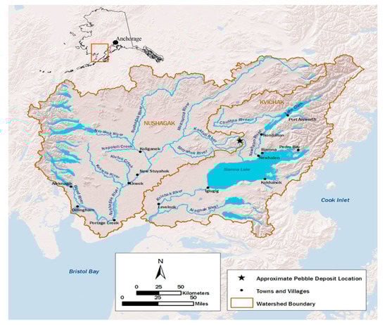 - Malloy, K.; Benkert, R.; (Alaska Department of Fish and Game (ADFG)); Vohden, J.; Lovell, S.; (ADNR); Harpole, G.; Kusche, K.; (Alaska Department of Environmental Conservation (ADEC)). Field Report, Pebble Copper/Gold Project, June 2010. Available online: http://dnr.alaska.gov/mlw/mining/largemine/pebble/field-reports/index.cfm (accessed on 20 June 2019).
