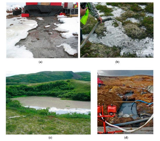 Drilling waste at Pebble was disposed of directly onto the landscape (Figure 2a–c) [,] or run through a series of unlined sumps to settle cuttings before pumping sump water onto the landscape for disposal (Figure 2d). Heavier material-like cuttings would sink in the sump, and are presumed to remain there; the sump was then covered with the initial soil mat that had been removed. Lining a sump would involve deploying and installing the liner, which is time consuming and expensive; as a result, liners are only occasionally used in sumps for drill cuttings, and were not utilized at this site.