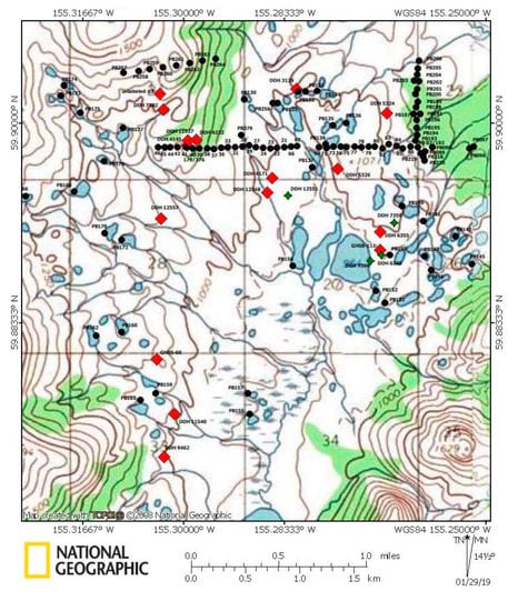 The USGS performed studies in the Pebble deposit region from 2007–2009, collecting soil, rock, sediment, and water samples []. Samples collected by USGS have the identifier “PB” and analytical methods are available [].