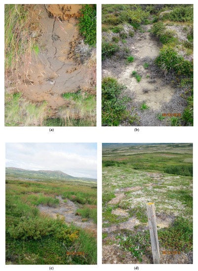 Oxidized and unoxidized cuttings from drill waste. Drill waste has a very fine texture and presents as either a gray color (unoxidized cuttings) or yellow–orange (oxidized cuttings). Drill waste was disposed of on land possibly 10–12 years prior to when these photos were taken in August 2016. (a) The fine texture and a mix of oxidized and unoxidized material, from widespread disposal near site DDH 6355, (b) Unoxidized cuttings, near site DDH 4145, (c) Swath of dead vegetation near DDH 6355, (d) Trail of drill cuttings from drill stem at DDH 4232. Photo credit: K. Zamzow.