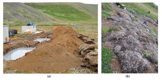 Reclamation of drill sumps. Many sumps could be clearly identified by the dead vegetation on the sump cover. (a) Sump in operation, with tundra mats set to the side for reclamation [], (b) Sump cover 2016. Photo credit 2016 sump: K. Zamzow.