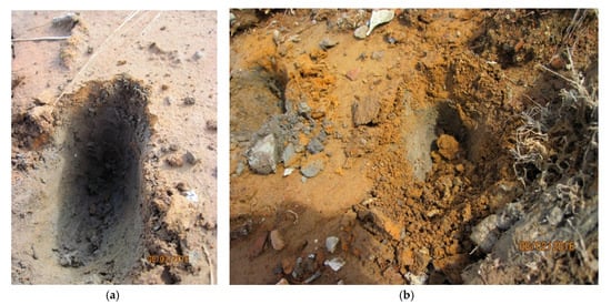 When a sump is dug, the overlying vegetation and soil are removed and set aside to be placed over the sump during reclamation. This is referred to here as “reclamation soil”, “tundra mat”, or “vegetation”. At many sites, the location of the sumps were evident by the lack of vegetation as a distinct rectangle covering them, despite no evidence of cuttings (Figure 5) [,,]. Reclamation soil samples were collected at three sites (DDH 5324, DDH 11527, DDH 12557) to determine if there was chemical contamination. At site DDH11527, an attempt was made to retrieve drill waste in a sump. A hole was dug 2-feet deep into the cover of the sump and a 34-inch steel pipe was driven 24-inches further down (total depth, 47 inches). However, the core retrieved was the color and texture of reclamation soil, not drill waste.
