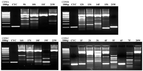 Many samples had artifacts around 100 bp in length. With many artifacts, the smaller size bands can move more slowly through the agarose, and so may appear to have a slightly larger size than their true value. Bands that appeared to be at 100 bp or just slightly larger (in the presence of artifacts) were considered positive. A good example of this difference in position can be found in sample CDWZ1F beside CYC (Figure 2).