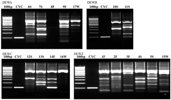 C. cayetanensis DNA amplification from environmental and wildlife fecal samples collected from Devon Avenue (DEW). The transect the samples were collected from is denoted as A–C and Z followed by the sample number and type (F = feces, S = soil, and W = water). The DNA was amplified using two rounds of PCR. The 100 bp standard (located in lane 1, far left, in each image) was used to assess the amplicon size. The Cyclospora (CYC) DNA (located in lane 2 of all gels) represents the correct positive band position at 100 bp. Positive samples were identified by a positive band at 100 bp.