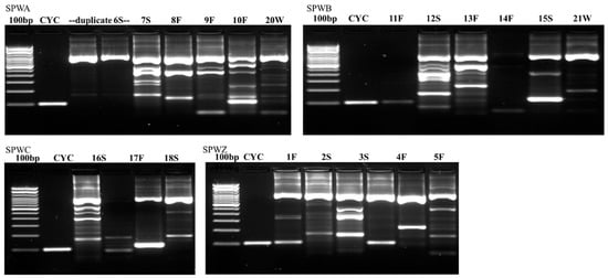 C. cayetanensis DNA amplification from environmental and wildlife fecal samples collected from St. Paul Woods (SPW). The transect the samples were collected from is denoted as A–C and Z followed by the sample number and type (F = feces, S = soil, and W = water). The DNA was amplified using two rounds of PCR. The 100 bp standard (located in lane 1, far left, in each image) was used to assess the amplicon size. The Cyclospora (CYC) DNA (located in lane 2 of all gels) represents the correct positive band position at 100 bp. Positive samples were identified by a positive band at 100 bp.