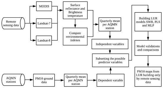 In Alvarez-Mendoza et al. [12], only remote sensing data were considered to compute the LUR model based in a MLR without a method to select predictors. In this work, three main objectives are proposed: (i) Using only remote sensing data will be used to establish LUR models without any AOD predictor; (ii) making a comparison between three different remote sensing satellite/sensors (MODIS, Landsat-7, and Landsat-8) to retrieve long-term PM10 considering only a selection of predictors and; (iii) comparing the accuracy of different techniques (STW, PLS, and MLP) in the generation of the predictive models. The two last items are the new contributions of this work.