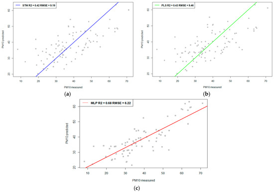 The LUR models are computed considering STW and PLS regressions in a linear way and MLP in a non-linear way. They are shown and compared in Table 4 (Equations (7)–(12)). In the case of Landsat-7, the STW shows a coefficient of determination (R2) of 0.37, the PLS a R2 of 0.36, and, for MLP, a R2 of 0.46. The lowest root-mean-square error (RMSE) was obtained for STW with a value of 9.47. For Landsat-8, in STW a R2 of 0.42 was obtained, and a R2 of 0.43 for PLS, and a R2 of 0.68 for MLP (Figure 3). The lowest RMSE obtained was for MLP. Finally, for MODIS, a R2 of 0.15 for STW, a R2 of 0.19 for PLS and a R2 of 0.25 for MLP were obtained. The lowest RMSE was for STW.