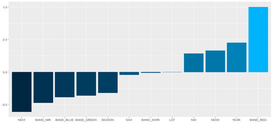 Figure 5 shows the relative variable importance according to the assigned weights, where the red band is the most significant in the model, while LST presented the lowest significance.