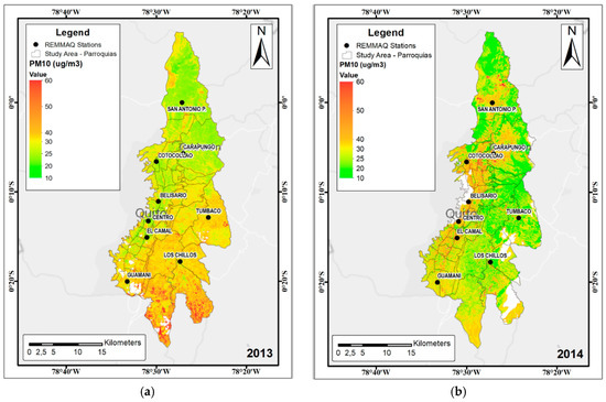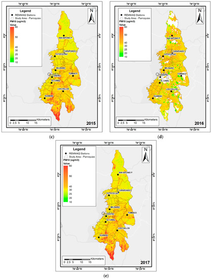 Figure 6 shows variations year by year according to PM10 mean concentration based on in-situ data (REEMAQ Stations). We choose the third season to show the variation year by year (2013–2017), because we have more remote sensing data available (without a high cloud density) during this time-window. According to the results presented in Figure 6, an increasing of PM10 concentration between 2013 to 2017 is notorious in the most of the urban parishes [59]. However, some areas showed a decreasing tendency in some years. The lowest PM10 concentration was found in some peripheral parishes during the 2014 year, because the air stations that influence these parishes (Tumbaco and Los Chillos) had a variation in the concentrations. Thus, Tumbaco and Los Chillos stations are in the east part of the study area and began to present the lower values in 2014 followed by 2013, according to the in-situ measures. After 2014, the PM10 values for these stations began to increase. The main reason could be related to the new operation of the new airport of Quito (2013), and the construction of important road infrastructures around it (end of 2014). Another possible explication is the traffic influence during the last years, particularly in the peripheral areas where an increase was registered since 2015 and also the increase of the population in these areas [60]. In the northern parishes, the stations of San Antonio P. and Carapungo are influenced by the presence of stone and sandy point quarries [61]. The stations Centro, Belisario, and El Camal are in the city downtown, and it is the main reason that an increase of PM10 concentration during the last years is verified in the center parishes.