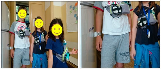Picture of children wearing the shoulder bag equipped with a micro-aethalometer, model AE51. GPSs were worn as wristwatch or necklace.