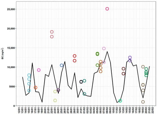 Average MRH BC concentrations measured at an urban background reference site (black line) and average home-to-school commuting personal exposure values (circles) during the 2019 personal exposure monitoring campaign. The colors of the circles correspond to the different days of monitoring.