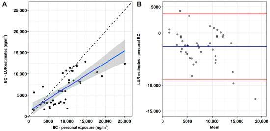 Personal MRH LUR estimates averaged over all points along the route ranged from 1365 ng/m3 to 12,886 ng/m3 with mean ± SD of 6365 ± 3676 ng/m3. Figure 3A shows a high correlation between average home-to-school estimates and personal BC measures (r = 0.74, p < 0.001). However, on average the MRH LUR model underestimated concentrations by about 29% (Table 2). The Bland-Altman plot visualizes this underestimate (blue line), and shows a slight trend in under- and over-estimating values at the extremes (Figure 3A). Lin’s Concordance Correlation Coefficient is 0.6 (95% C.I.: 0.43–0.74) and shows moderate concordance between methods.