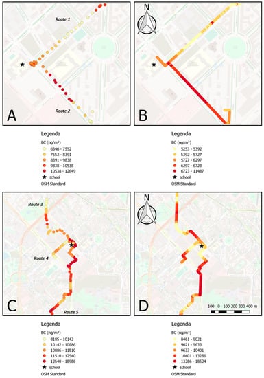 Personal exposure to BC in urban environments is of high health concern to many people, and even more so for schoolchildren traveling to school during rush hours []. In particular, we recently found that morning rush hour (MRH) during weekdays is the most critical period for exposure to TRAP in Milan, with an average increase of BC concentration of about 1 µg/m3 in both spring and winter time [].