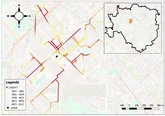The routes from home-to-school were drawn in a Geographical Information System (GIS) environment following the procedure below: (a) uploading GPS data and selecting only routes from home-to-school; (b) checking the paths by comparing them with the routes drawn by children and parents; (c) adjusting home-to-school routes, i.e., missing GPS data were replaced with the drawn path; (d) converting routes to 1 m equidistant points along each line. Then, for each point we estimated the BC concentration by applying the MRH LUR model. To remove possible outliers from the distribution of modeled BC values, a threshold equal to the highest seasonal BC value from the 2018 monitoring campaign +20% was set [].