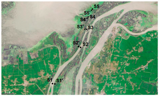 The land use patterns of the Hongze Lake estuary area have changed in the past decades. Culture ponds and farmland area showed an increasing trend while open water area and the community of arbor and shrub plants showed a decreasing trend. Ten sampling points were set up in this study to include a variety of different land use patterns. As shown in Figure 1, there were five soil points with different utilization patterns, including S1’ (Culture Pond), S2’ (Farmland), S3’ (Reed Field), S4’ (Poplar Forest), and S5’ (Withy Grove). Five sediment samples were set up for the corresponding river courses with serial numbers of S1, S2, S3, S4, and S5 respectively. Ten samples were collected for each sample point, and the distance between each sample was about 20 m.