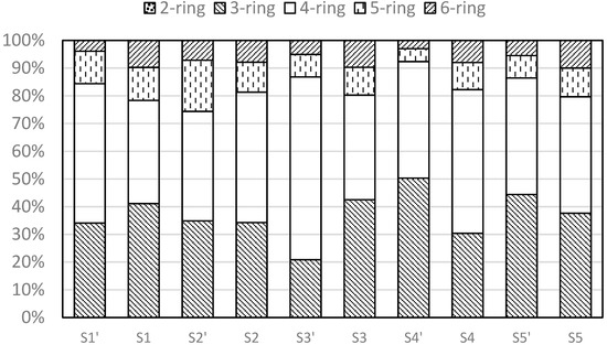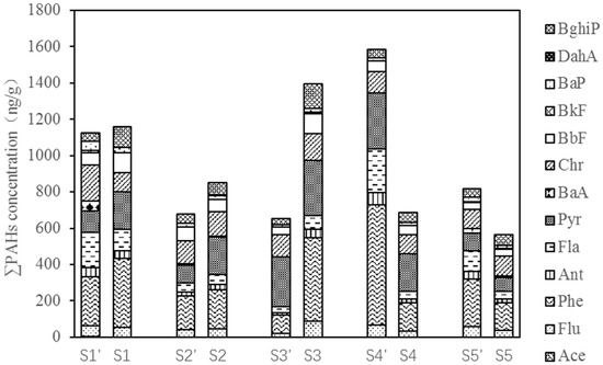 Pollution levels of ∑PAHs was previously classified into four groups: unpolluted (0–200 ng/g), low (200–600 ng/g), moderate (600–1000 ng/g), and high (greater than 1000 ng/g) [18]. As shown in Appendix B, in soil spots, Culture Pond(S1’) and Poplar Forest (S4’) were highly polluted. Other sites were moderately polluted. In sediment spots, S1 and S3 were highly polluted, S5 was low polluted, while other spots were moderately polluted.