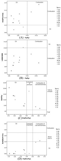 The results of PAHs source ratio analysis. (A) Ratios of Fla/(Pyr) vs. Ant/(Ant + Phe), (B) Fla/(Pyr) vs. LMW/HMW (C) Fla/(Fla + Pyr) vs. BaP/Pyr, (D) Fla/(Fla + Pyr) vs. BaA/(BaA + Chr).