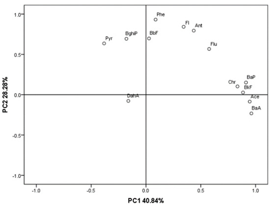 The distribution of each source was also effectively determined by using the principal component analysis (PCA). In this study, two factors with eigenvalues >2 were extracted, and two principal components were extracted. The cumulative contribution rate was 69.12%. The principal components (PC1 and PC2) were identified and respectively accounted for 40.84% and 28.28% of the total variance. Characteristic compounds emitted from various sources are shown in Table 3. PC1 had loaded for most PAHs with high-ring (BaA, BaP, BkF, Chr) and highly weighted by Ace which is considered to be derived from combustion of fossil fuel. PC2 had loaded for most PAHs with low-ring (Ant, Phe, Flu) which is considered to be an oil source (showed in Figure 5).