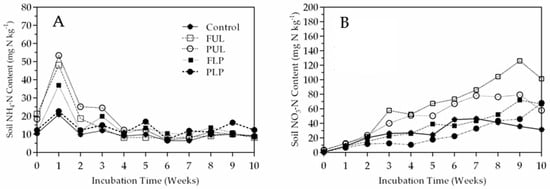 Under the controlled conditions of soil moisture and temperature of our incubation study, the evolution of inorganic N content after addition of broiler litter materials to soil were also affected by the C:N ratio of each broiler litter product. In general, when organic materials with C:N ratios of less than 15:1 are added to soil, there is usually a rapid release of mineral NH4+ early in the mineralization process []. In our study, the rapid release of NH4+ and subsequent NO3-N accumulation as a result of biological nitrification was most rapid for the FUL and PUL treatments with C:N ratio of 10.5:1. In contrast, C:N ratios higher than 25:1 promote N immobilization by soil microorganisms through the conversion of soil NH4-N and NO3-N into organic N lowering the inorganic N available for plant growth [,]. For C:N ratios in between 15 and 25, N mineralization is slow and immobilization may occur []. In our study the QW treated broiler litter materials, FLP and PLP, had C:N ratios > 15 that resulted in slow release of soil NH4-N and NO3-N with low NH3 and N2O emission losses.