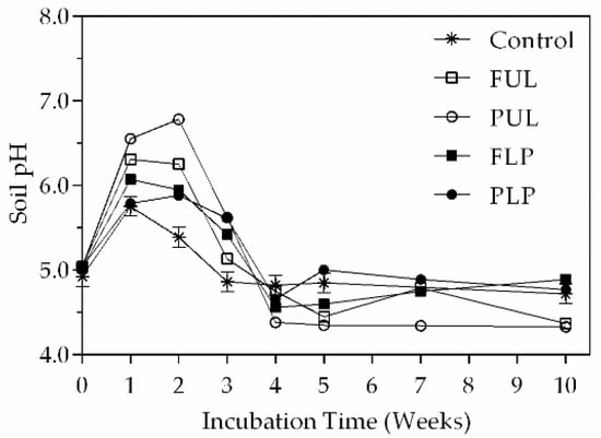 The addition to the soil of the four poultry litter materials initially increased the soil pH (Figure 2). At the onset of the incubation, the average soil pH was 5.03 but it rapidly increased in the first week to a value of 6.31 for the FUL, and in the second week to 6.78 for the PUL, possibly caused by the alkalinity of the materials (pH = 7.95, Table 2). In contrast, the soil pH increased only to values of 5.95 for the FLP and 5.88 for the PLP in the first week of incubation. These lower pH values were expected because of the acidic nature and low NH4-N content of these materials (Table 2). After four weeks of incubation, soil pH declined to values below pH 5.0 in all treatments along with diminishing soil NH4-N because of increasing microbial nitrification, an acid forming process. However, these lower pH values did not inhibit nitrification in the FUL and PUL treatments or fully explain the slow nitrification rates of the FLP and PLP treatments since the nitrification rates in acidic soils can equal or exceed those of neutral soils [].