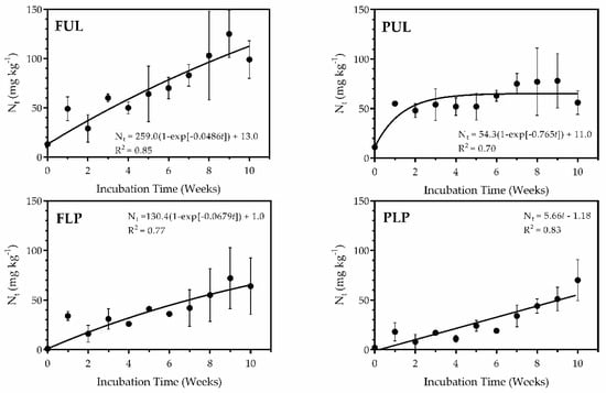 where Nt is the total inorganic N (NO3-N + NH4-N) concentration minus control concentrations, NO is the potentially available organic N, k is a rate constant, t the is time of incubation, and Ni is initial N at t = 0. The nonlinear procedure of Prism 7, GraphPad Software, Inc. (San Diego, CA, USA) was used to fit Equation (2) to experimental soil Nt, t, and NO.