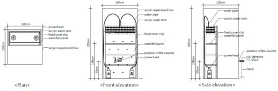 We used ITC-201A (ANDES Electric Co., Ltd., Hachinohe, Japan) as the PAI and NAI detector. The horizontal distance between the detector and waterscape was 70 cm, and the vertical distance was 50 cm above ground (Figure 2). The detector can detect the concentrations of PAIs and NAIs with electron mobility values greater than 0.5 cm2 V−1 s−1 per unit air volume. The detector has a measurement range of 10–1,236,000 pcs/cm3 and a detection interval of 0.5 s; the detector also measures air temperature and humidity. We calibrated the detector for 30 s for the height, width, slope, tiers, and impact points in the experimental device in order to ensure steady detector operation. Subsequently, we used the detector to conduct the measurements.