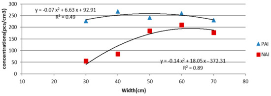 We set five experiments based on waterfall width values (i.e., 30, 40, 50, 60, and 70 cm) and compared generated PAI and NAI concentrations. The NAI concentrations ranged from 55 to 210 pcs/cm3, whereas the PAI concentrations ranged from 227 to 268 pcs/cm3 (Table 2). PAI concentrations were higher than NAI. Regression analysis results showed that the correlation between the waterscape width and ion concentration could be expressed by a quadratic polynomial. In particular, the R2 value for the NAI–waterfall width and correlations was 0.89, while the correlation coefficient of the PAI–waterfall width was 0.49 (Figure 4). Furthermore, the lowest monopole coefficient (q) was 1.2, which was observed for a width of 60 cm.