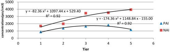 We set five waterfall tiers (i.e., 1, 2, 3, 4, and 5 tiers) and compared the PAI and NAI concentrations at these tiers. The NAI concentrations ranged from 1686 to 3940 pcs/cm3, whereas the PAI concentrations ranged from 868 to 1648 pcs/cm3 (Table 3). In contrast to the results in the preceding experiments, the NAI concentrations were greater than the PAI concentrations in this experiment. The regression analysis results also revealed that the correlation between the waterfall tier and ion concentration could be expressed by a quadratic polynomial. Specifically, the R2 values for the PAI–waterfall tier and NAI–waterfall tier correlations were the same (0.92; Figure 5). Additionally, all monopole coefficients (q) determined at the five tiers were less than 1; the lowest coefficient was 0.3, which was detected when the number of tiers was 5. According to Kong et al. [33], a low monopole coefficient (q) indicates comfort for people. Thus, the experimental results indicate that waterfall tier can be a parameter that leads to ion concentrations providing comfort to people.