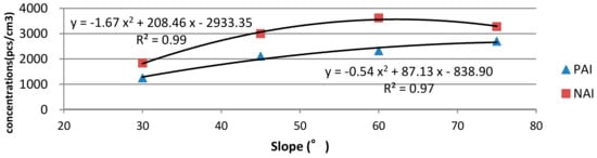 We set four slope levels (i.e., 30°, 45°, 60°, and 75°) and compared the ion concentrations at these slopes. The NAI concentrations ranged from 1837 to 3619 pcs/cm3, and the PAI concentrations ranged from 1248 to 2699 pcs/cm3 (Table 4). The NAIs were more than the PAIs at all four slopes. The regression analysis results showed that the correlation between the waterfall slope and ion concentration could be expressed by a quadratic polynomial. Specifically, the R2 values for the NAI–waterfall slope and PAI–waterfall slope correlations were 0.99 and 0.97, respectively (Figure 6). The monopole coefficients (q) of four slope types did not exceed 1; the lowest coefficient was 0.6, which was observed at the 60 degree slope.