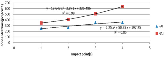 We set four waterfall impact points (i.e., 1, 2, 3, and 4 points) and compared the PAI and NAI concentrations generated when these impact points were applied. The NAI concentrations ranged from 348 to 637 pcs/cm3, and the PAI concentrations ranged from 254 to 356 pcs/cm3 (Table 5). The NAI concentrations were slightly higher than the PAI concentrations at all four points. The regression analysis results demonstrated that the correlation between the impact points and ion concentrations could be expressed by a quadratic polynomial. Specifically, the R2 values for the NAI–impact point and PAI–impact point correlations were 0.99 and 0.85, respectively (Figure 7). The monopole coefficients (q) were less than 1 at all four points; the lowest coefficient was 0.6 and was observed when the number of impact points was set to 2 and 4. These results indicate that the number of impact points could serve a parameter of comfort among people.