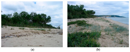 The risk of coastal flooding over the Bulgarian Black Sea Coast is particularly low due to the small amplitude tides and the lack of big rivers flowing into the sea [28]. The only threat comes from unusual storm surge levels in combination with reinforced waves upon the shore [29]. These extreme meteorological events may cause the flooding of low-lying areas and the erosion of dunes (Figure 1a). As a result, the coastal areas lose their buffering function permanently or till the recovery of plant communities of dominant sand stabilizers, mostly within one vegetation season (Figure 1b).
