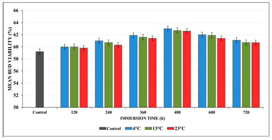 Treated rhizomes retained their viability when submerged in sea water till the end of the simulations (720 h). Though treated replicates were tested in different sea water temperature conditions, MBV showed identical trends (Figure 2). MBV gradually increased and reached its maximum at the 480th hour of sea water immersion, followed by slight decrease till the 720th h of the flooding simulation (Figure 2). All the treatments had higher values than the MBV of the untreated controls and appeared to be enhanced slightly by sea water (p = 0.042).
