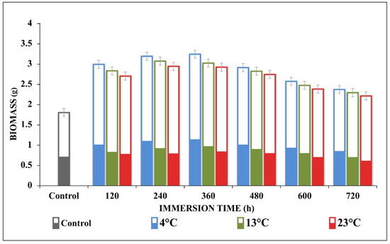 The dry weight biomass demonstrated the same trend as other variables, characterized by increasing till the 360th h of the experiment followed by decreasing to values of biomass that were higher than those of the controls (Figure 3). Rhizomes in all treatments were not affected significantly by submergence duration (p = 0.065) and water temperature (p = 0.077).