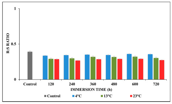 The R:S ratio had a tendency to be decreased by higher water temperatures (Figure 4), but the effect was statistically insignificant (p = 0.068). Treated plants demonstrated a slight increase of biomass allocation to roots (Figure 4).
