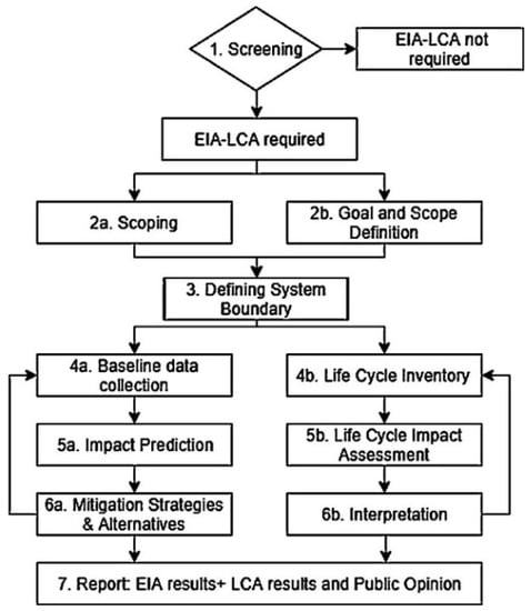 This study has successfully outlined a framework to integrate LCA in various steps of EIA, which is applicable to not only large scale or medium scale development projects but also to geographically defined regions. Even though this framework is time- and data-intensive, it can be utilized to assess various environmental, social, and economic impacts of both local and global importance. The framework can aid decision-makers during procurement of raw materials, comparison between various alternatives of a project, site analysis for projects, comparing various technologies, and planning the decommissioning of the project for enhanced material recovery.